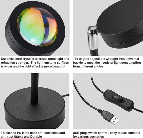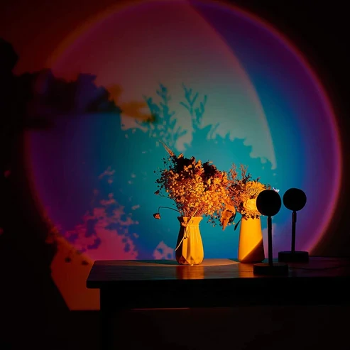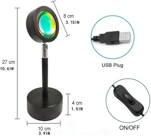 Lámpara de ambiente con proyección de efecto puesta de sol o arcoíris, ideal para crear espacios cálidos, modernos y fotogénicos. Perfecta para el hogar, tiendas, cafeterías, bares o sesiones de fotografía. Su diseño permite rotación de hasta 180° para lograr distintos efectos visuales, adaptándose al estilo de cada espacio.